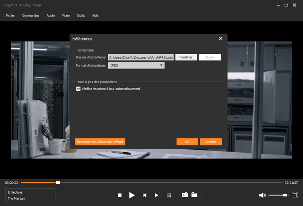Pendant que la vidéo est en lecture, cliquez sur le bouton "Instantané" pour prendre une photo à partir de la vidéo. Cliquez sur Ouvrir le dossier d'instantané pour trouver l'image capturée. Vous pouvez choisir le format d'instantané et le dossier d'instantanée dans la fenêtre "Préférences". Et aussi, vous pouvez enregistrer l'image en format JPEG, PNG et BMP.
