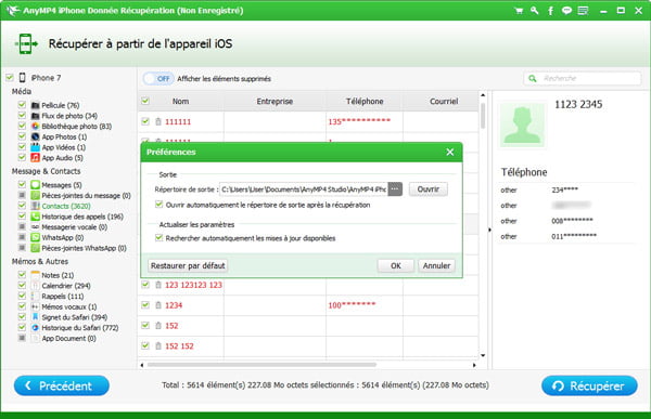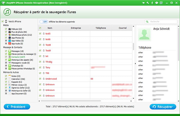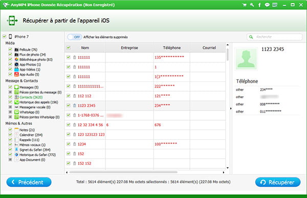 Pour iPhone4, iPhone 3GS, vous pouvez récupérer : Contacts, Messages, Historique des Appels, Calendrier, Notes, Rappels, Safari Signet,Pellicule, Photothèque, Flux de Photo, Message Pièces jointes, Mémos Vocaux.
