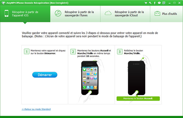 Après avoir démarré ce logiciel, veuillez cliquer sur le bouton Récupérer à partir de périphérique iOS, cliquez sur le bouton commencer à anylser quand vous avez connecté votre iPhone sur PC. Pour iPhone 4 et iPhone 3GS, vous devez télécharger en outre un Plug-in.