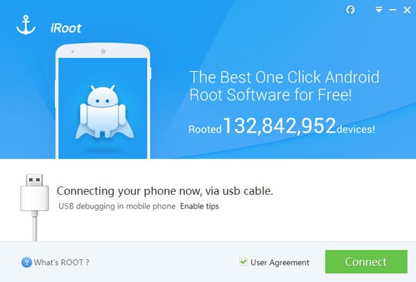 Connectez un appareil Android au PC avec un câble USB. Lancez iRoot, puis cliquez sur le bouton de "Connect" pour détecter votre téléphone automatiquement.