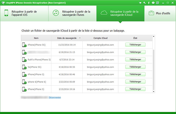 Après l'analyse de votre compte, vous verrez toutes les sauvegardes faites avec votre compte iCloud dans le logiciel. Elles sont toutes téléchargeables pour vous, veuillez choisir une sauvegarde en cliquant sur le bouton Télécharger, le processus durera un peu long si la taille de votre sauvegarde est grande.