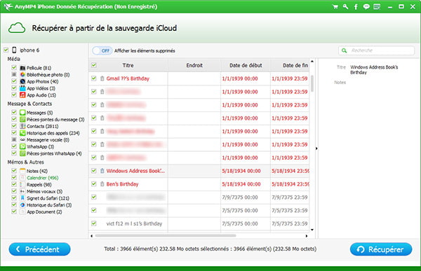 Après le téléchargement de la sauvegarde d'iCloud, tous les fichiers se trouveront dans le logiciel. Vous pouvez cliquer sur les différents noeuds pour prévisualiser les fichiers. Les fichiers supprimés sont en couleur rouge et en avant. La recherche sera très facile. Vous pouvez cliquer simplement sur le bouton Récupérer pour récupérer les fichiers choisis.