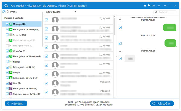Sélectionnez et cochez des messages à récupérer, et puis cliquez sur le bouton « Récupérer » en bas à droite de l'interface pour procéder à la récupération des SMS iPhone.