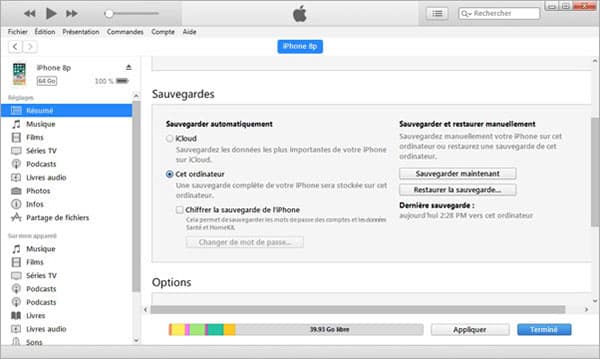 Cliquez sur « Résumé » sous « Réglage ». Dans la zone « Sauvegardes », cochez « Cet ordinateur » et puis cliquez sur le bouton « Sauvegarder maintenant ». Attendez un peu, la durée dépend de la quantité des données sur iPhone.