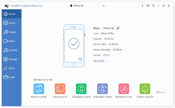AnyMP4 Transfert iPhone Pro est un logiciel de transfert des données iPhone professionnel, qui permet de transférer des données entre l'appareil iOS (iPhone/iPad/iPod) et l'ordinateur, ou entre les appareils iOS différents. Après le dernier renouvellement, il supporte bien le dernier iOS 13 et iPhone 11/11 Pro/X/XS/8/8 Plus.