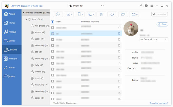 Note: De plus, ce programme possède encore beaucoup d'autres fonctions. Sélectionnez un contact, vous pouvez voir le détail dans la colonne à droite. Ici, il vous permet aussi de modifier ou supprimer un contact. En outre, il est également capable de nous aider à créer une sonnerie pour iPhone.