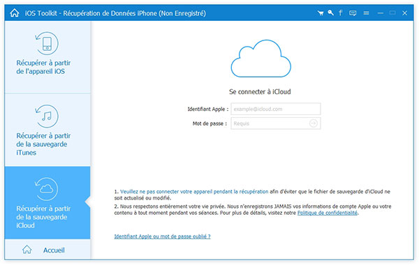 Cliquez sur « Récupération de Données iPhone » > « Récupérer à partir de la sauvegarde iCloud » pour utiliser cette fonctionnalité. Connectez-vous à votre identifiant Apple et votre mot de passe.