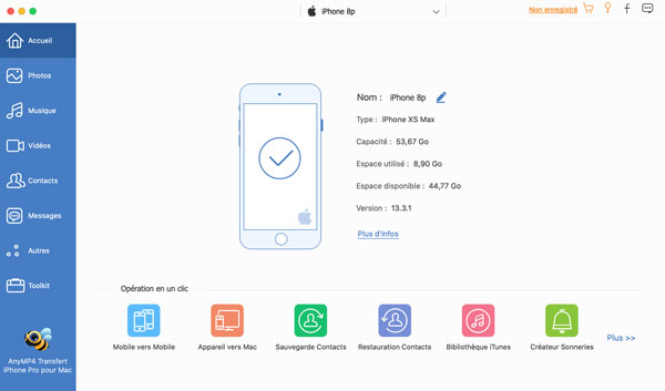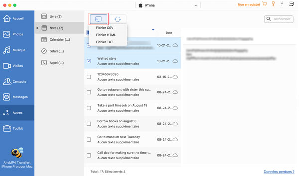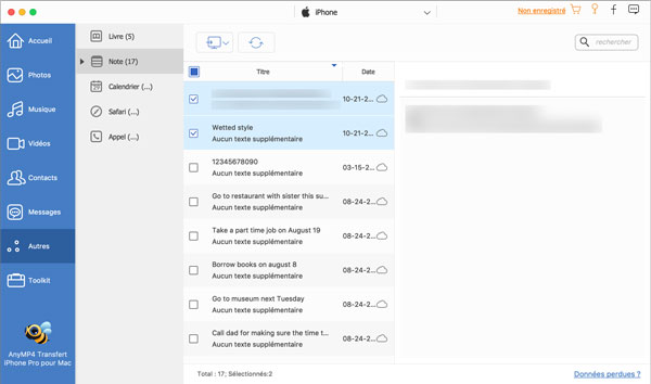 Utiliser un logiciel professionnel de transfert des données iOS peut faciliter le processus de transfert des notes iPhone. Vous pourriez ainsi essayer de se servir d'AnyMP4 Transfert iPhone Pro pour Mac. Son interface conviviale nous permet de copier des notes iPhone vers Mac plus facilement.