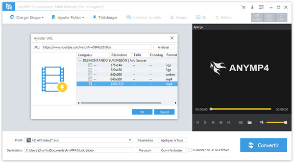 Après avoir téléchargé ce logiciel, cliquez sur Télécharger pour télécharger la vidéo YouTube. Copiez L'URL de la vidéo YouTube que vous voulez lire, il sera collé dans le programme automatiquement. Cliquez sur « Analyser » pour analyser l'URL. Et ensuite choisissez la définition ou le format que vous voulez. Cliquez sur « OK ».