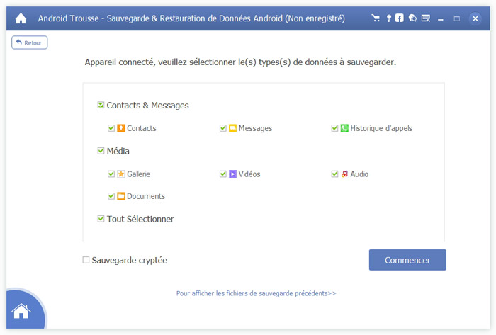 Après la détection, sélectionnez « Messages » à analyser. En outre, si vous voulez sauvegarder des messages Android avec le mot de passe, cochez « Sauvegarde cryptée ».