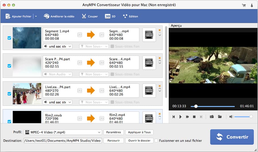 Dédié aux amateurs de vidéo, AnyMP4 Convertisseur Vidéo pour Mac peut convertir n'importe quel format vidéo en plusieurs formats compatibles avec des périphériques portables. Par exemple, vous pouvez l'utiliser pour convertir vidéo AVI populaire en format MOV qui est pris en charge par iPod, iPad et QuickTime Player.